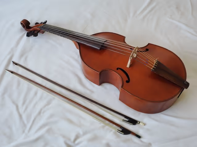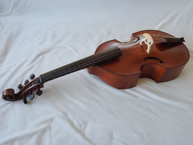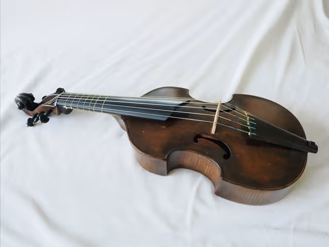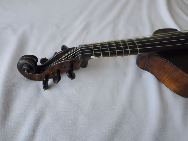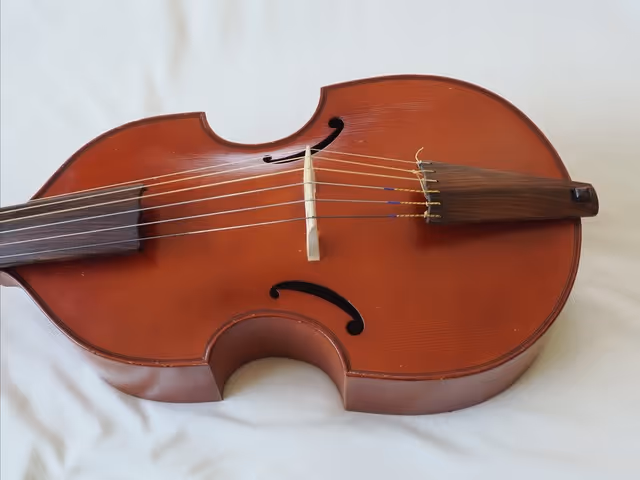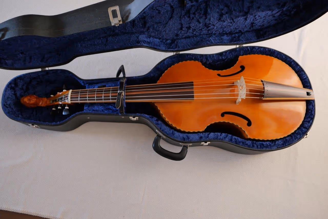 Bass Viola da Gamba in Gitarrenform. Baujahr und Bauer unbekannt. Wahrscheinlich die 50-er Jahre. Feinstimmwirbel, ausgeglichener Klang, gute Resonanz, genaue Ansprache, gute Saiten, (Kürschner und Pirastro) Mensur 63,5 cm. Ideal für einen Anfänger oder Schüler geeignet.
