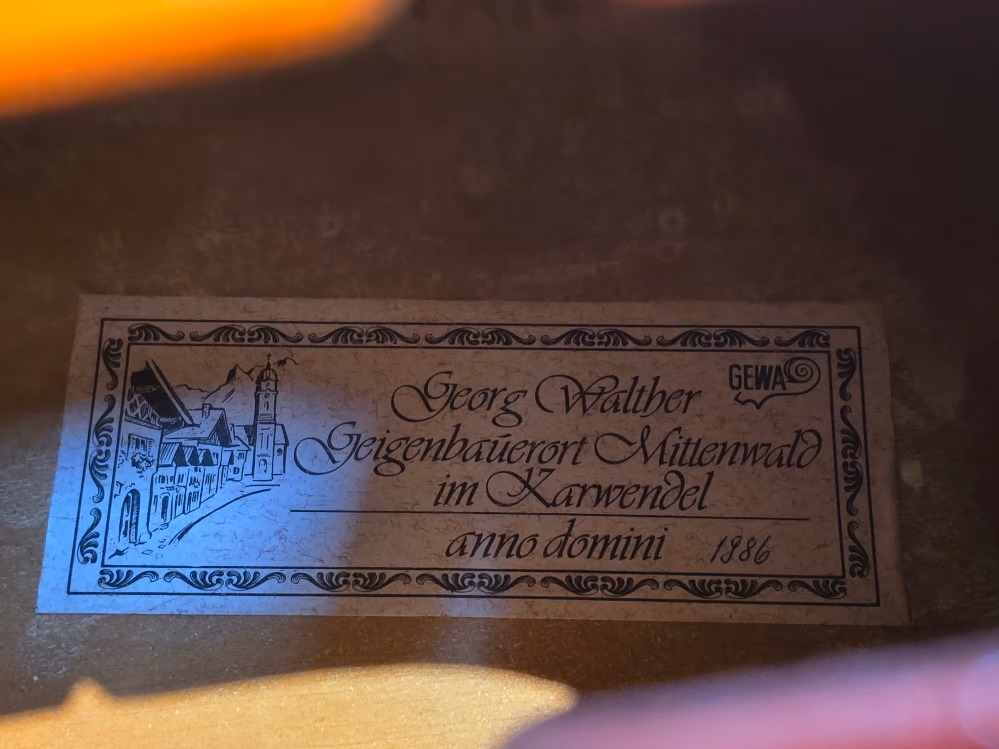 Marke: Georg Walther (Zertifikat im inneren)Geigenbauer Mittenwald, BJ 1986.