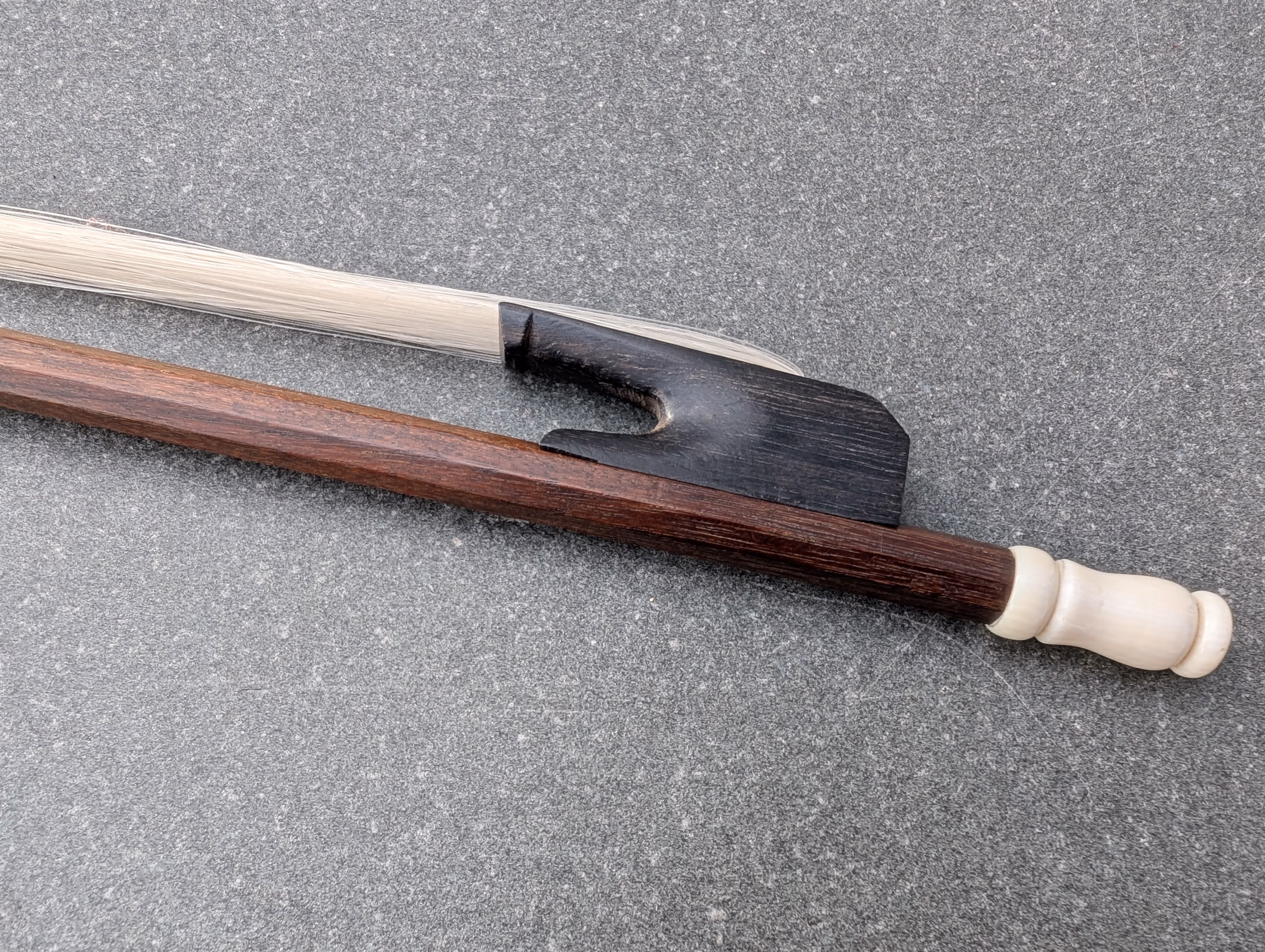 1. Bogen: Rundes Profil, Kopfplatte aus Elfenbein, Gewicht 50 g, Haarlänge 600 mm, Gesamtlänge (Holz) 675 mm